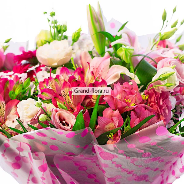 ДЕЛЮКС: лилия розовая -  3 шт, альстромерия розовая - 21 шт, эустома розовая - 11 шт, эустома белая  -  10 шт, декоративная зелень, фетр розовый. Примерный диаметр букета 50х50 см.