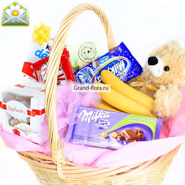 Стандартный: конфеты "Raffaello", Бисквиты "Kinder-Delice" - 1 уп., шоколадные батончики "Milky Way", шоколадные батончики "Kit Kat", шоколад "Milka", открытка, мишка стандарт (20-30 см.), бант, декор, корзина средняя.