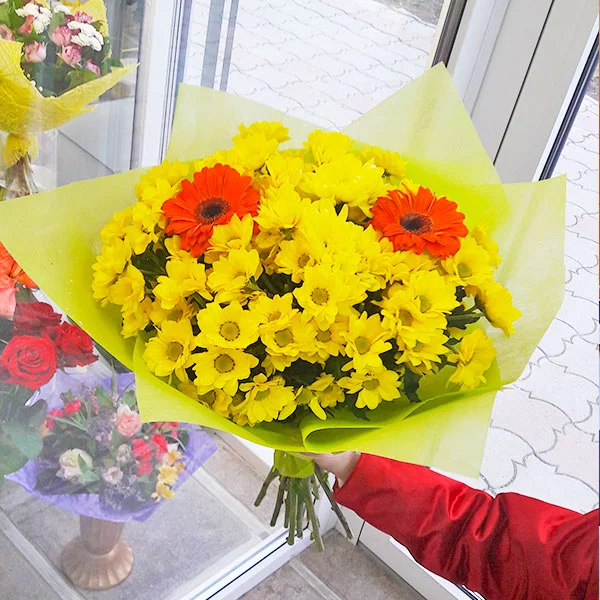 Яркий букет, в центр которого помещена пара огненных гербер, завершает солнечная кустовая хризантема. Такое сочетание цветов вмиг поднимет настроение его получателю. Игривая композиция поможет выразить глубокое чувство привязанности и любви, а также станет великолепным вариантом в качестве подарка значимой женщине в день ее рождения. Ваша мама наверняка запомнит столь очаровательную композицию, а девушка моментально забудет все обиды.