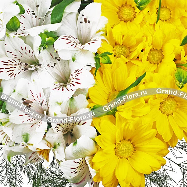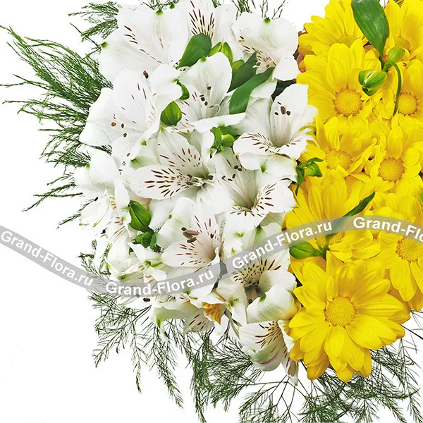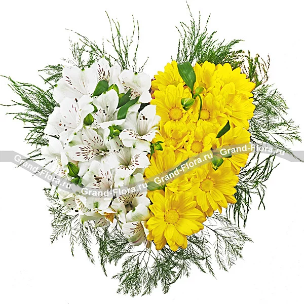 Стандартный (на фото): хризантема кустовая ромашковая желтая - 3 шт., альстромерия белая - 4 шт., аспарагус, оазис сердце.