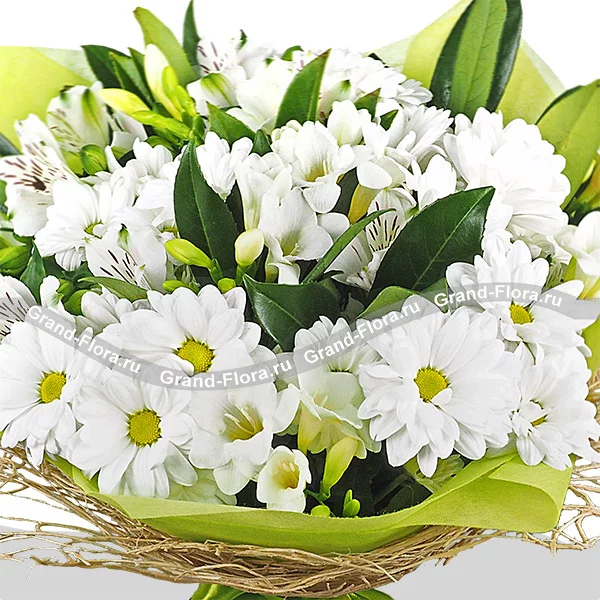 ДЕЛЮКС: хризантема кустовая ромашковая - 15 шт, фрезия/альстромерия белая - 10 шт, альстромерия белая - 14 шт, салал, фетр зеленый, натуральная упаковка.