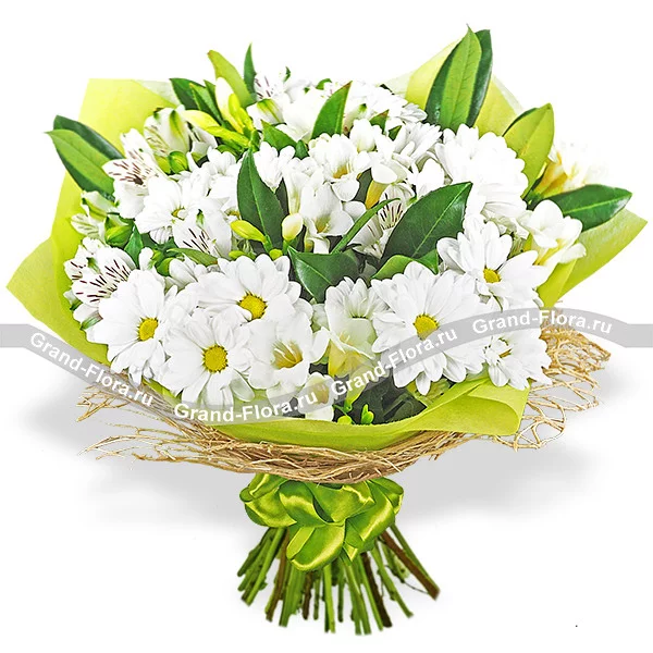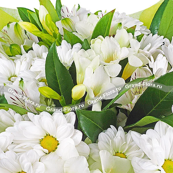 Стандартный (на фото): хризантема кустовая ромашковая - 5 шт, фрезия белая - 3 шт, альстромерия белая - 4 шт, салал, фетр зеленый, натуральная упаковка.