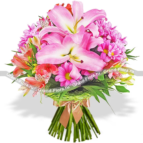 (на фото): лилия розовая (возможна замена на белую)- 1 шт., хризантема кустовая фиолетовая - 3 шт., альстромерия розовая - 1 шт., альстромерия оранжевая - 4 шт., салал, упаковка натуральная зеленая, золотой бант. Примерный диаметр букета 30х30 см.