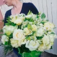 ЛЮКС: роза белая - 5 шт., альстромерия белая - 9 шт., эустома белая - 9 шт., салал, сетка зеленая. Примерный объем букета 40х40 см.