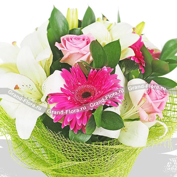 Шикарная композиция состоит из нежных розовых роз, выразительных малиновых гербер и утонченных белых лилий. Цветочное трио выгодно подчеркивает рускус и зеленая декоративная обертка из сетки.