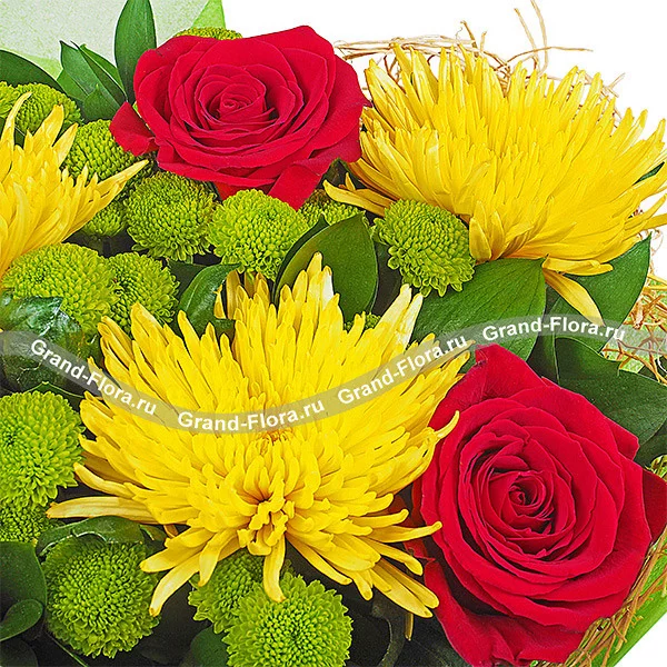 ДЕЛЮКС: роза красная - 8 шт, хризантема одноголовая желтая - 7 шт, хризантема кустовая зеленая - 6 шт, рускус, фетр зеленый.