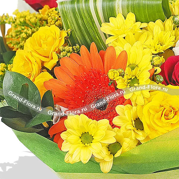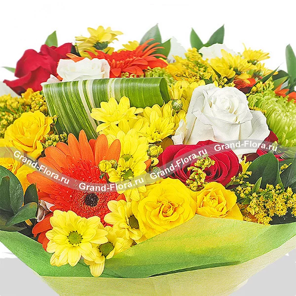 Стандартный (на фото): роза красная - 3 шт., роза белая - 3 шт., гербера оранжевая/красная - 3 шт., кустовая роза желтая/кремовая - 3 шт., хризантема кустовая желтая - 3 шт., декоративная зелень, упаковка