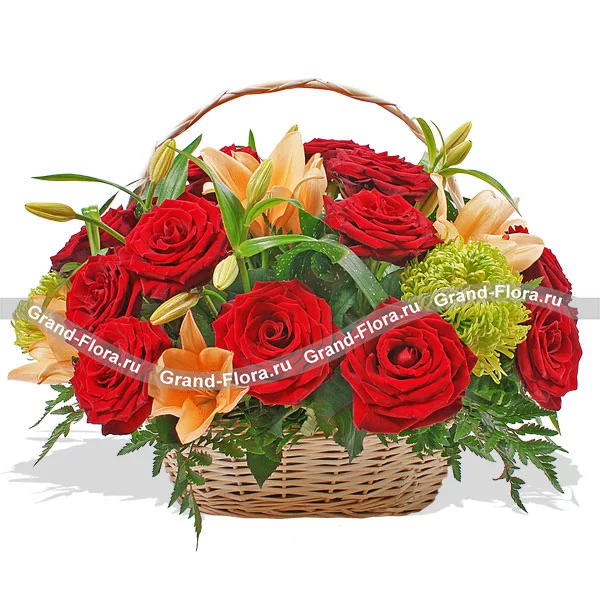 Уменьшенный: роза красная - 5 шт., лилия желтая (по сезону. возможна замена на белую) - 1 шт., хризантема одноголовая зеленая - 2 шт., салал, папоротник - 4 шт., оазис, корзина.