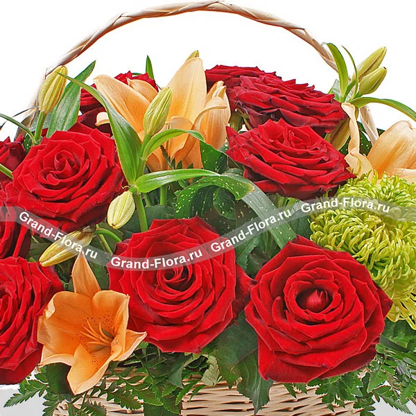 ДЕЛЮКС: роза красная - 25 шт., лилия желтая (по сезону. возможна замена на белую) - 4 шт., хризантема одноголовая зеленая - 7 шт., салал, папоротник - 8 шт., оазис, корзина.