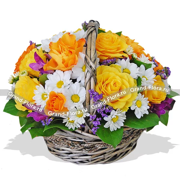 Уменьшенный: роза желтая - 5 шт, хризантема кустовая ромашковая (белая) - 3 шт, альстромерия фиолетовая - 1 шт, статица - 1 шт, декоративная зелень, оазис, корзина.