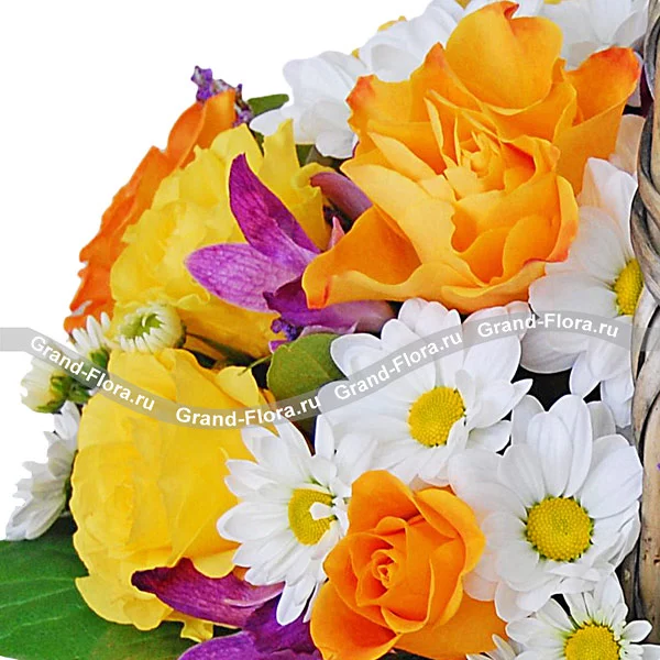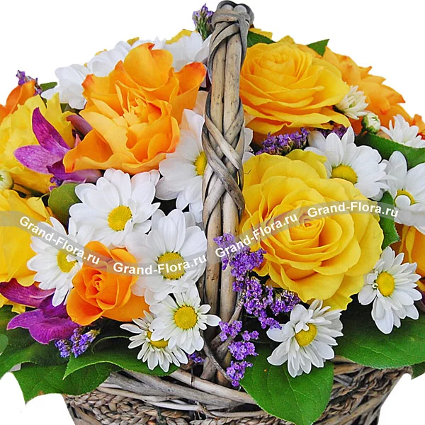 ДЕЛЮКС: роза желтая - 21 шт, хризантема кустовая ромашковая (белая) - 8 шт, альстромерия фиолетовая - 6 шт, статица - 6 шт, декоративная зелень, оазис, корзина.