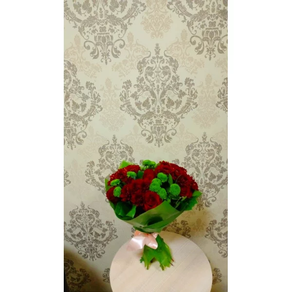 ЛЮКС: хризантема кустовая красная - 5 шт., хризантема зеленая кустовая - 5 шт., роза красная кустовая - 6шт., салал, фетр зеленый.