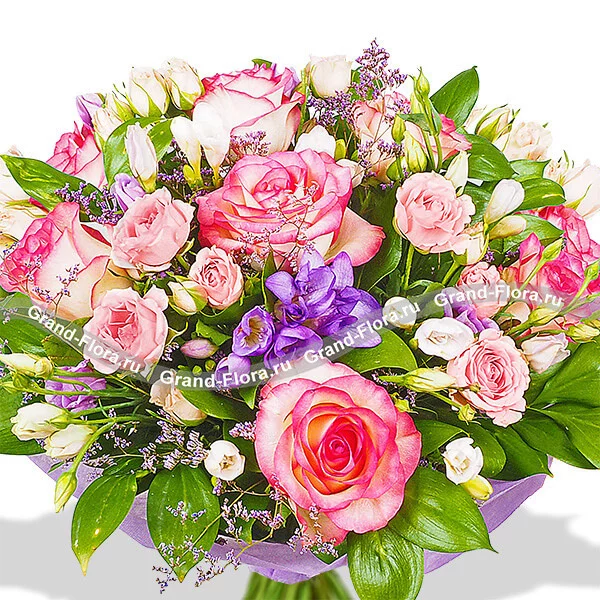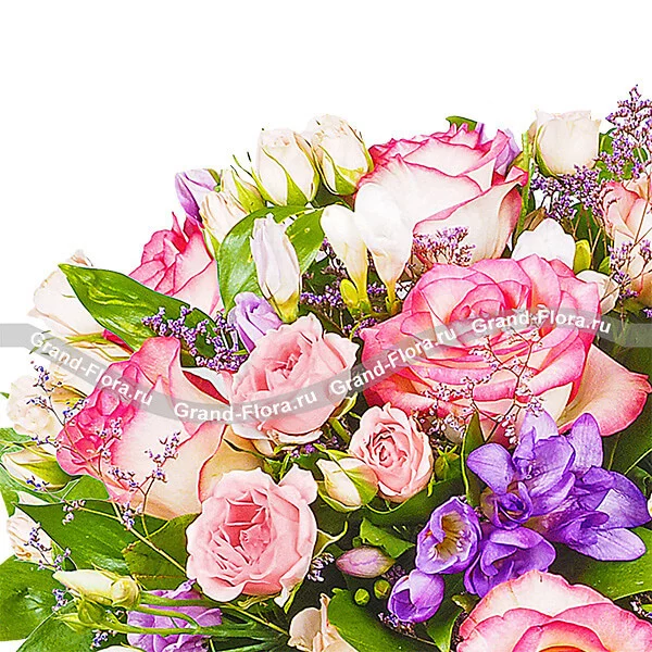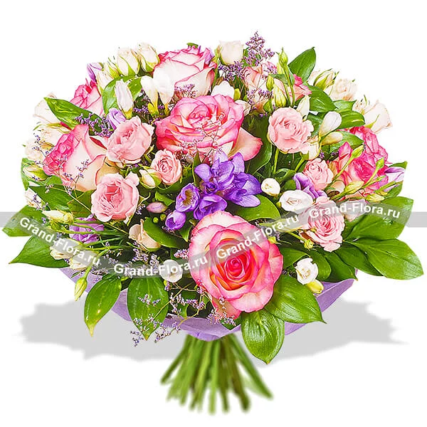 Букет состоит из двух видов роз нежно-розового оттенка – кустовых и обычных. Изящество цветов великолепно подчеркивают фрезии и утонченная белая эустома. Завершает композицию дополнение из декоративной зелени и фиолетового фетра в тон фрезий.