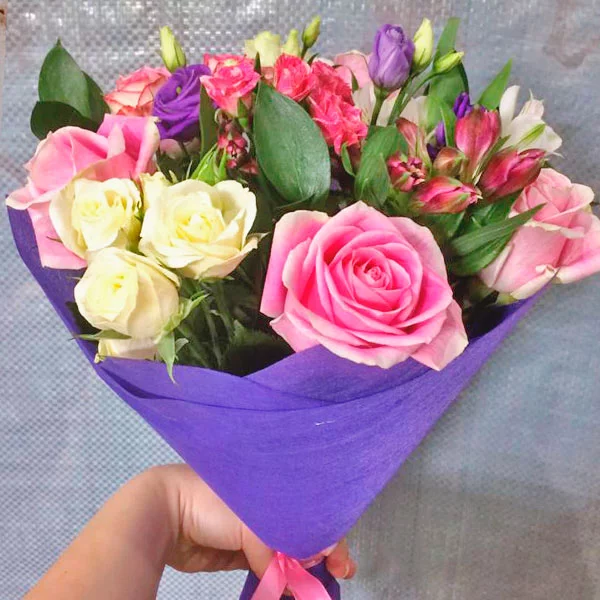 ЛЮКС (на фото): роза розовая - 7 шт, роза кустовая розовая - 2 шт, роза кустовая белая - 1 шт, фрезия(альстромерия) фиолетовая - 2 шт, фрезия(альстромерия) белая - 2 шт, эустома белая - 3 шт, декоративная зелень, фетр фиолетовый. Примерный размер: 35Х35 см.