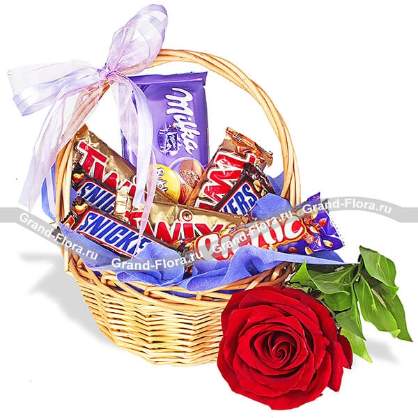 ЛЮКС: роза красная (70 см) - 1 шт., Twix - 4 шт., Snikers (маленький) - 4 шт., Picnic - 2 шт., шоколад "Milka" - 2 шт., декоративная зелень, корзина малая, фетр фиолетовый, бант сиреневый.