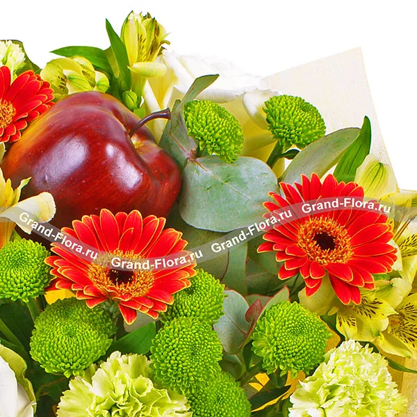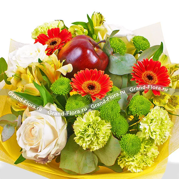 Стандартный: роза белая - 5 шт., гербера оранжевая - 2 шт., хризантема зеленая кустовая (сантини) - 2 шт., гвоздика зеленая - 2 шт., альстромерия желтая - 2 шт., эвкалипт - 2 шт., фетр желтый, бант оранжевый, яблоко декоративное.