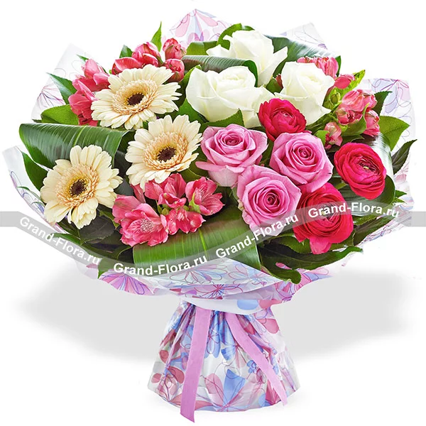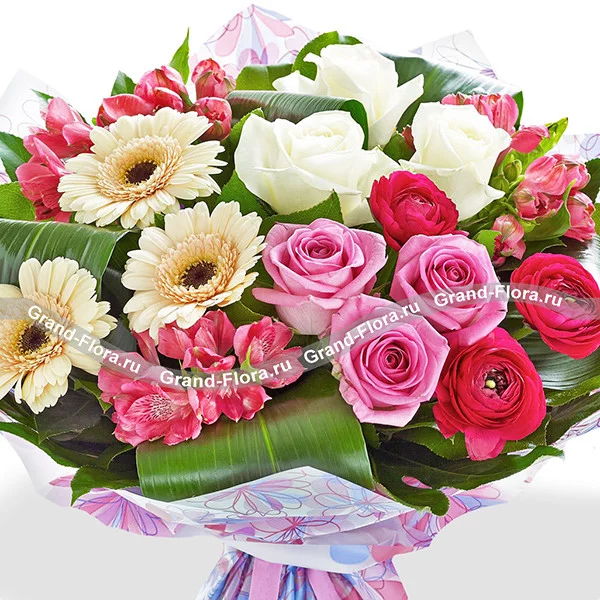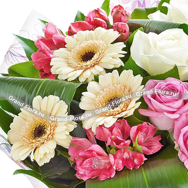 Вы верите в любовь с первого взгляда? Даже если Ваш ответ «нет», то он изменится в то мгновение, когда увидите этот великолепный букет, он тронет Вас до глубины души. Нежно бархатные белые и розовые розы расскажут о чистоте и искренности намерений, герберы – откроют Ваши тайные чувства, розовая альстромерия – обожание, ранункулюсы – теплоту и чувственность, а листы аспидистра, окутывая нежностью, завершат цветочное признание в любви.