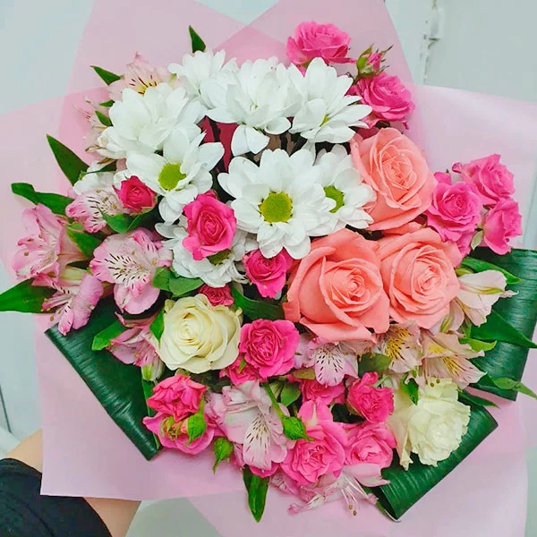 ДЕЛЮКС: роза белая - 4 шт., роза розовая - 5 шт., альстромерия розовая - 3 шт., гербера кремовая - 4 шт., кустовая роза розовая - 3 шт., лист аспидистра - 5 шт., упаковка розовая, лента розовая. Примерный размер: 45Х45 см.