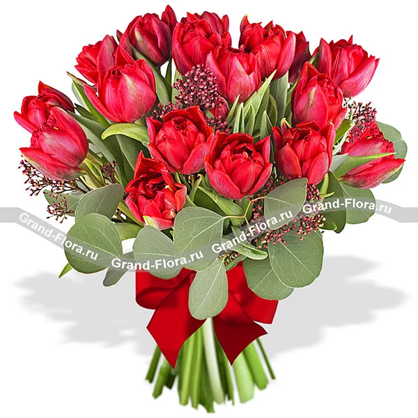 15 тюльпанов: тюльпаны красные - 15 шт., эвкалипт - 5 шт., бант красный.