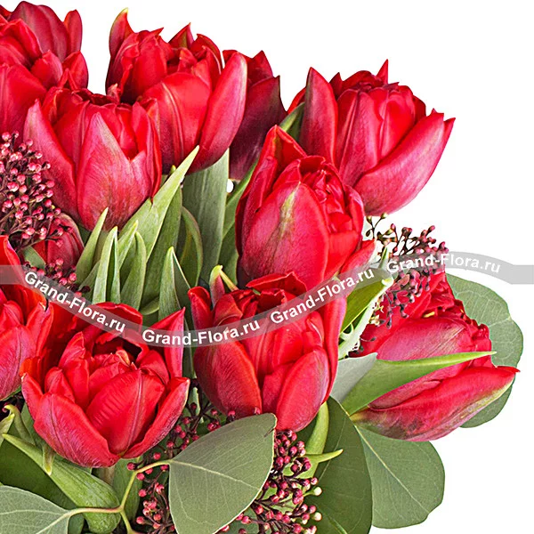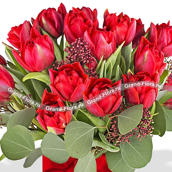 35 тюльпанов: тюльпаны красные - 35 шт., эвкалипт - 8 шт., бант красный.