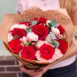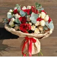 роза красная - 11 шт., роза кремовая кустовая - 10 шт., эвкалипт - 5 шт., гиперикум - 4 шт., упаковка, лента. Примерный размер: 45Х45 см.