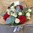 Уменьшенный: роза красная - 3 шт., роза кремовая кустовая - 2 шт., эвкалипт - 2 шт., гиперикум - 1 шт( Возможна замена на иные ягоды)., упаковка, лента. Примерный размер: 20Х20 см.