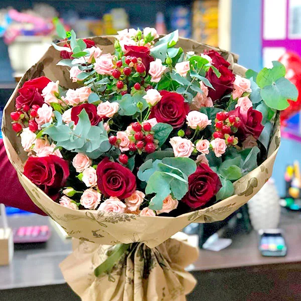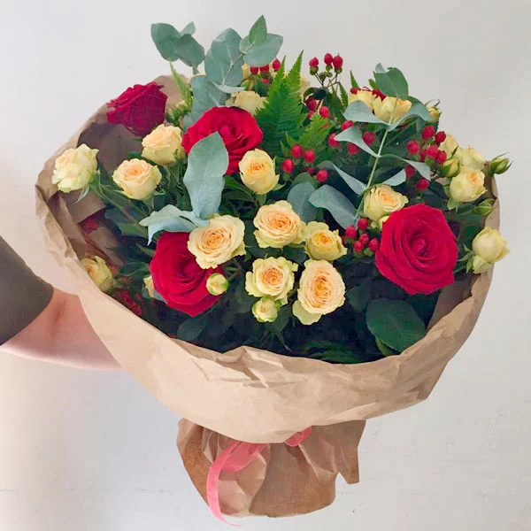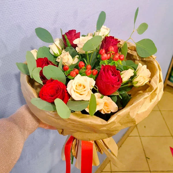ДЕЛЮКС: роза красная - 11 шт., роза кремовая кустовая - 10 шт., эвкалипт - 5 шт., гиперикум - 4 шт.т( Возможна замена на иные ягоды), упаковка, лента. Примерный размер: 45Х45 см.
