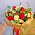 (на фото) роза красная - 5 шт., роза кремовая кустовая - 4 шт., эвкалипт - 3 шт., гиперикум - 2 шт., упаковка, лента. Примерный размер: 25Х25 см.
