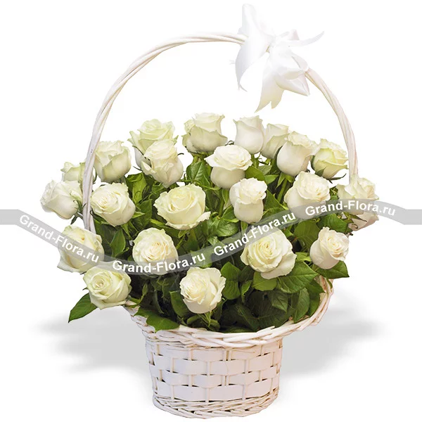 Роза белая - 31 шт., декоративная зелень, оазис, корзина, лента.