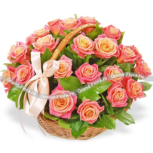 Роза персиковая (Мисс Пигги) - 25 шт., декоративная зелень, оазис, корзина, лента.