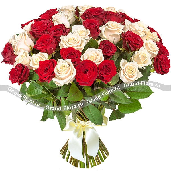 Роза белая и красная 70 см - 101 шт., лента.