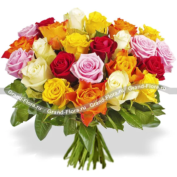 Роза  ассорти (желтые+красные+оранжевые+белые+розовые),50/60 см, упаковка, лента. На фото представлен букет из 29 роз.