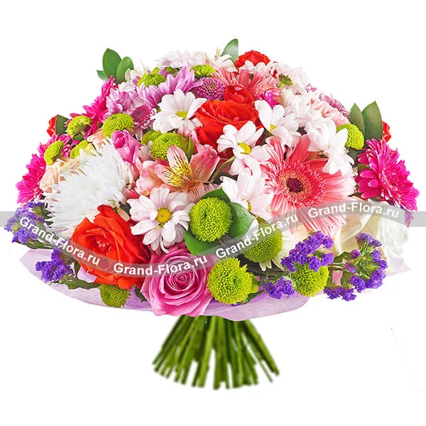 Роза розовая - 5 шт., роза белая - 5 шт., роза красная - 6 шт., гербера розовая - 3 шт., гербера малиновая - 4 шт., хризантема кустовая (белая и розовая) - 7 шт., хризантема кустовая зеленая - 4 шт., хризантема одноголовая белая - 3 шт.,  альстромерия (белая и розовая) - 4 шт.,   статица - 3 шт., фетр фиолетовый.