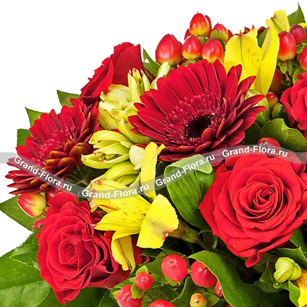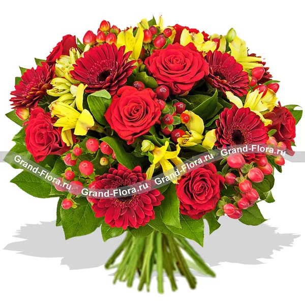 Роза красная - 16 шт., гербера красная - 15 шт., альстромерия желтая - 15 шт., гиперикум - 14 шт., салал, сетка.