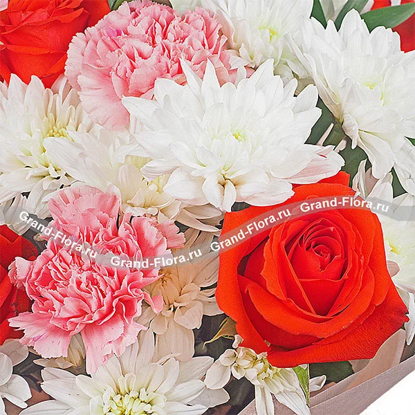 Роза красная - 15 шт., гвоздика розовая - 16 шт., хризантема кустовая белая - 10 шт., рускус, фетр розовый.