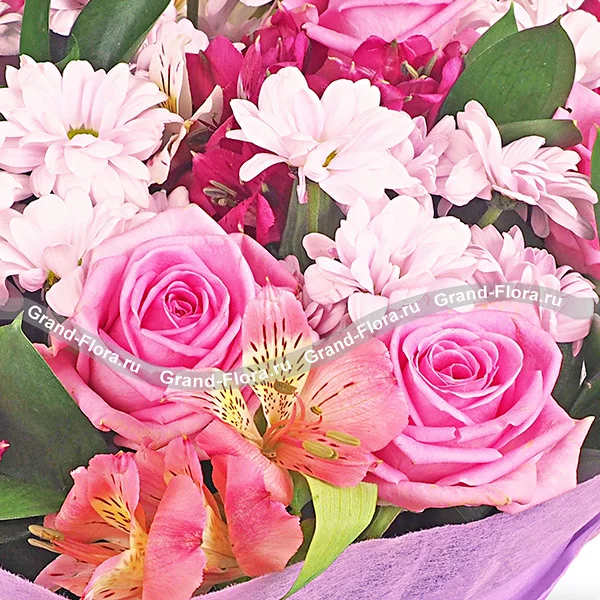 Стандартный: роза розовая - 5 шт, альстромерия розовая/сиреневая - 3 шт, хризантема кустовая светло-фиолетовая (возможна замена на белую) - 3 шт, рускус, упаковка, лента