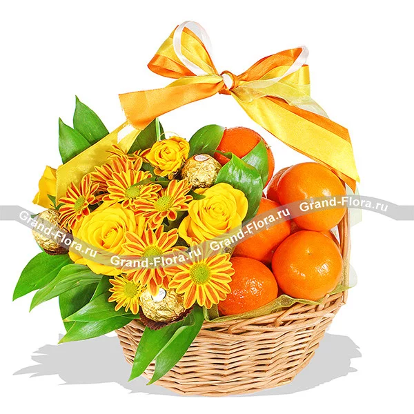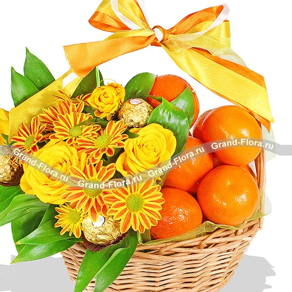 ЛЮКС: хризантема кустовая оранжевая - 5 шт, роза кустовая желтая - 4 шт, мандарины - 2 кг (возможна замена на апельсины), конфеты Ferrero Rocher, рускус, оазис, лента , корзинка.
