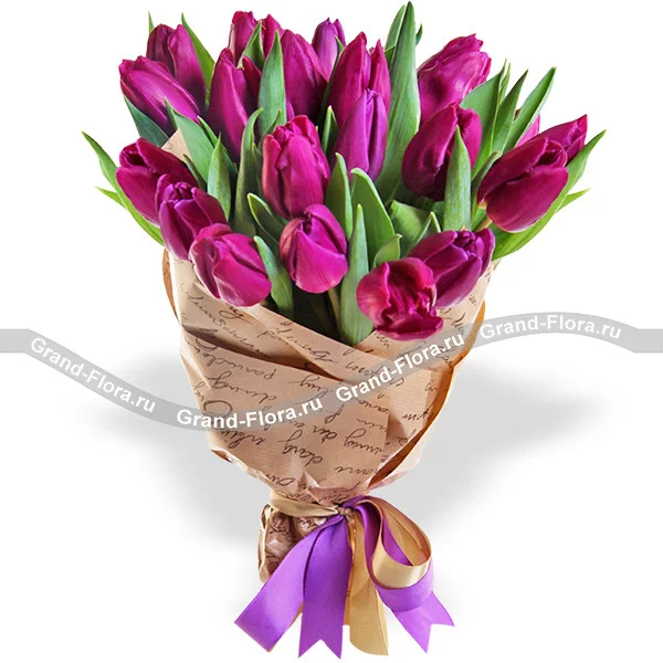 19 тюльпанов: тюльпаны фиолетовые - 19 шт., упаковка крафт, фиолетовый бант.