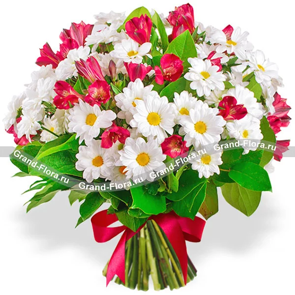Стандартный: хризантема кустовая ромашковидная - 10 шт., альстромерия красная - 5 шт., декоративная зелень., упаковка, лента красная.