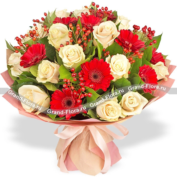 Стандартный: роза белая - 5 шт, гербера красная - 4 шт.,  гиперикум, декоративная зелень, упаковка крафт., лента., Примерный размер: 25Х25 см.