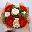Стандартный: роза белая - 5 шт, гербера красная - 4 шт.,  гиперикум (возможна замена на белую гипсофилу), декоративная зелень, упаковка крафт., лента., Примерный размер: 25Х25 см.