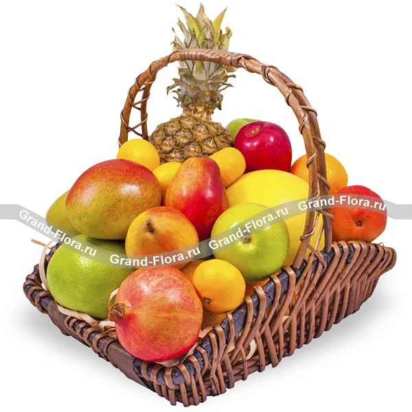 Стандартный: ананас - 1шт., мандарины - 0,5 кг., груша - 0,5 кг., яблоки - 0,5 кг., манго - 1шт., гранат - 1шт., помело - 2 шт., декор, корзина.