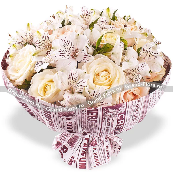 Роскошное сочетание кремовых роз и альстромерий станет великолепным цветочным подарком к любому торжеству! Нежность, легкость и красота в одном букете. Преподнесите этот букет тому, кто  занимает особое место в ваше сердце!