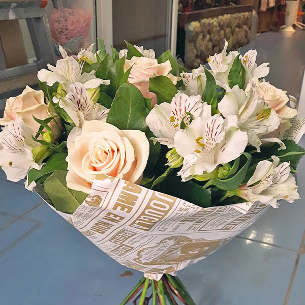 Люкс (на фото): роза кремовая - 15 шт., альстромерия белая - 6 шт., декоративная зелень, упаковка, лента. Примерный размер: 35Х35 см.