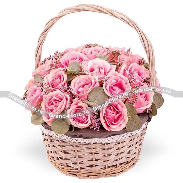 27 роз: роза розовая - 27 шт., декоративная зелень, оазис, корзина.