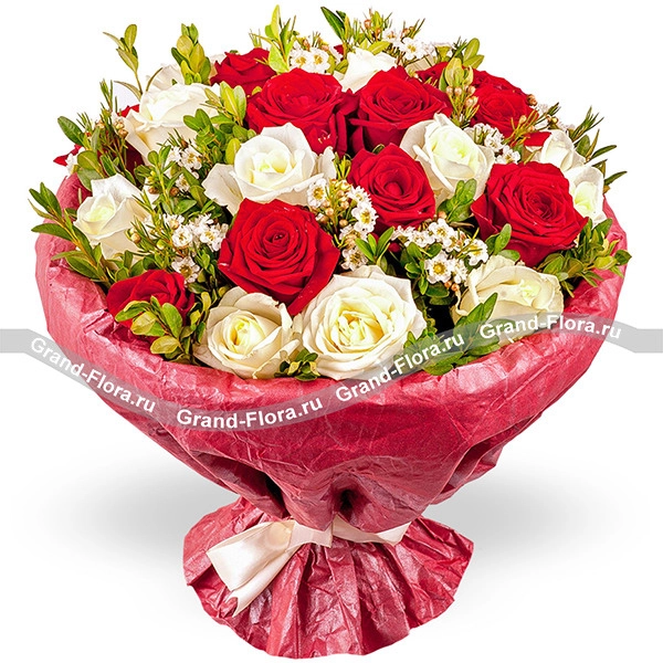 Стандартный: роза белая - 9 шт., роза красная - 8 шт., декоративная зелень, упаковка, лента.