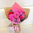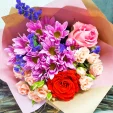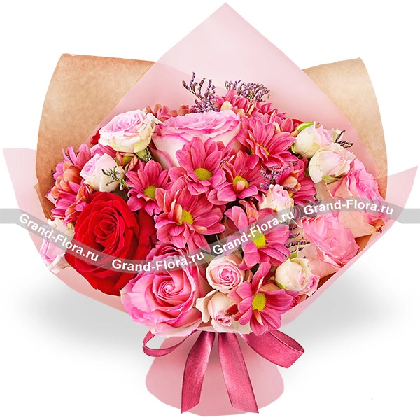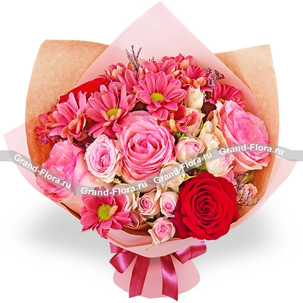 роза красная - 1 шт., роза розовая - 2 шт., кустовая роза розовая - 1 шт., хризантема кустовая розовая - 1 шт., лимониум, упаковка, лента.