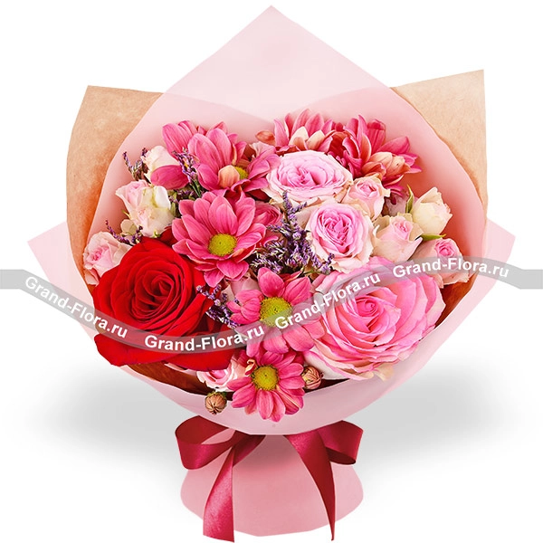 Уменьшенный: роза красная - 1 шт., роза розовая - 2 шт., кустовая роза розовая - 1 шт., хризантема кустовая розовая - 1 шт., лимониум, упаковка, лента.