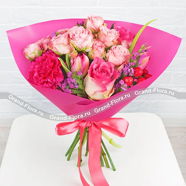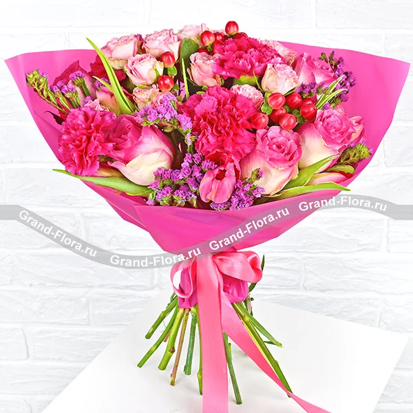 Люкс: гвоздика малиновая - 4 шт., роза розовая - 5 шт., тюльпан розовый - 5 шт., роза кустовая розовая - 3 шт., статица, гиперикум, упаковка, лента. Примерный размер 40см.