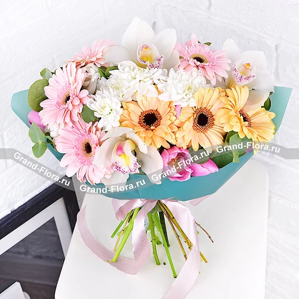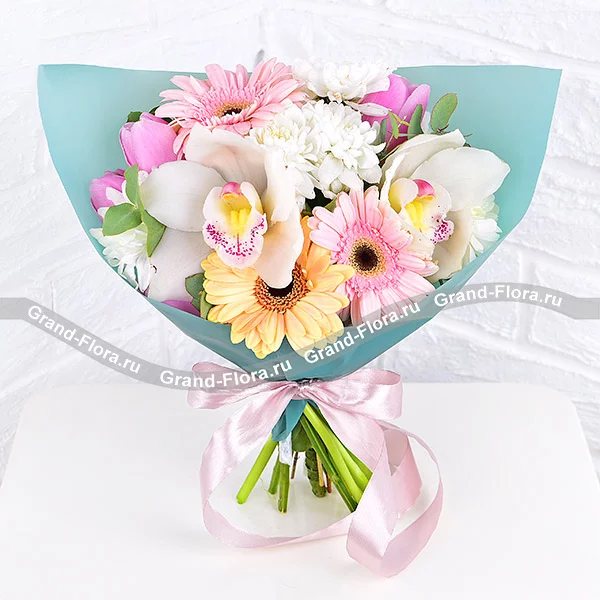 Стандартный: гербера розовая - 2 шт., гербера желтая - 1 шт., орхидея белая - 2 шт., тюльпан розовый - 3 шт., хризантема кустовая белая - 3 шт., декоративная зелень, упаковка, лента.